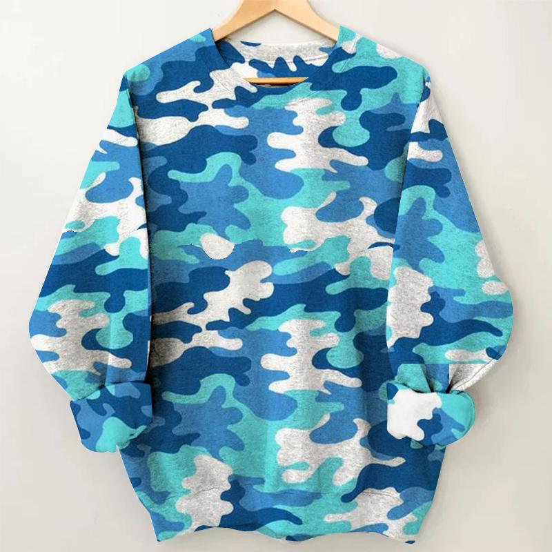 Women's Blue Camouflage Print Round Neck Sweatshirt
