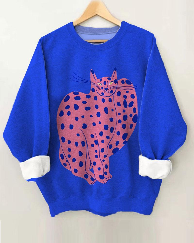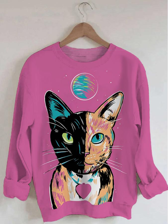 Women’s Cat Printing Long Sleeve Round Neck Sweatshirt