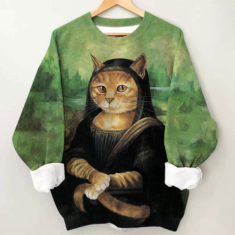 Women’s The Cat The Mona Lisa Printing Long Sleeve Round Neck Sweatshirt