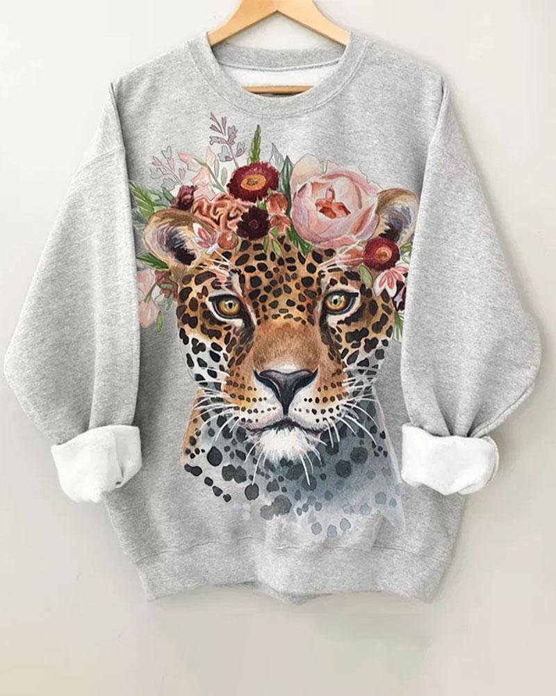 Women's Flower Cheetah Art Print Round Neck Long Sleeve Sweatshirt