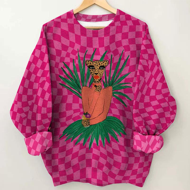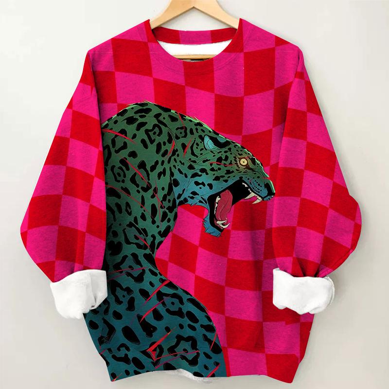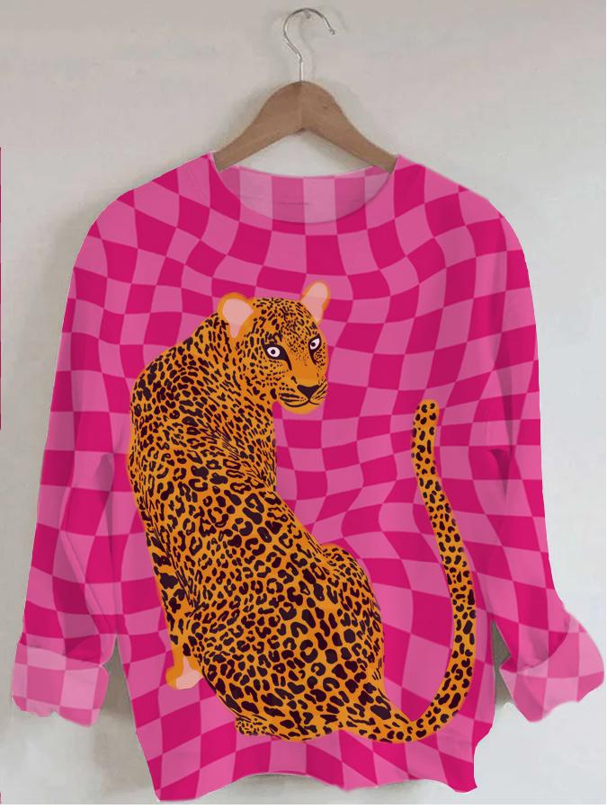Women's Plaid Leopard Print Long Sleeve Round Neck Sweatshirt