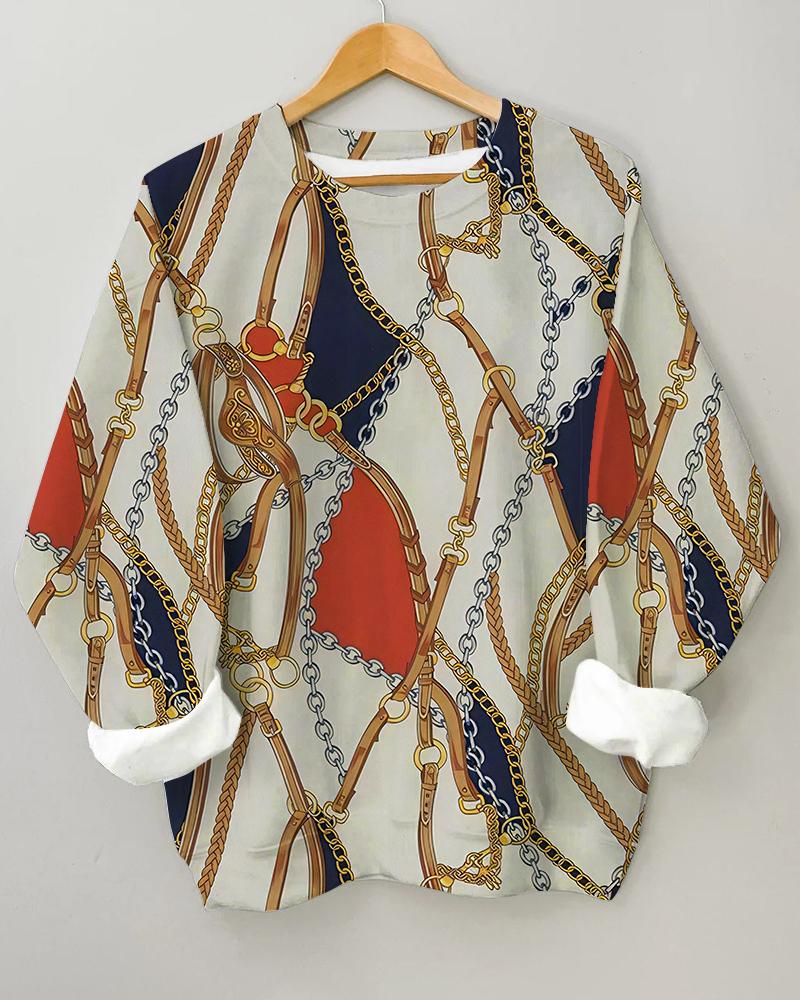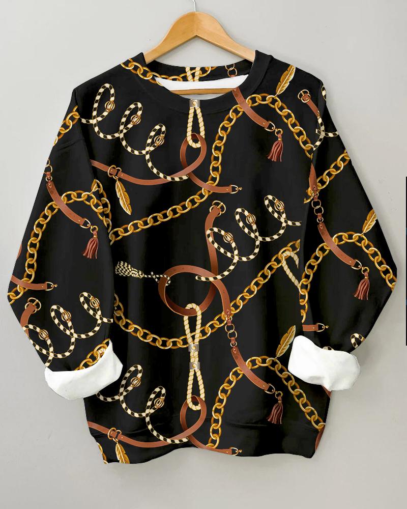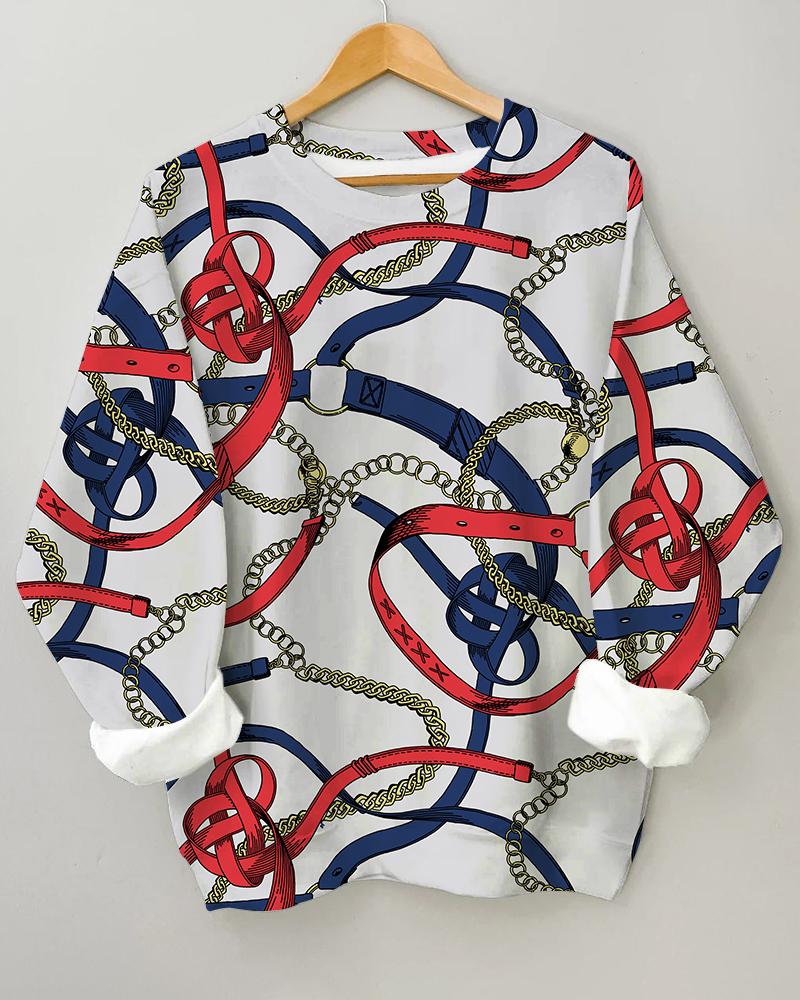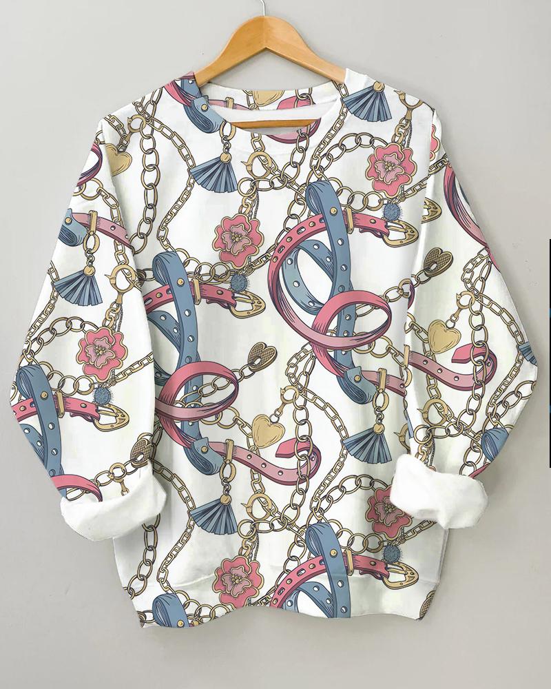 Women’s Metal Belt Printing Long Sleeve Round Neck Sweatshirt