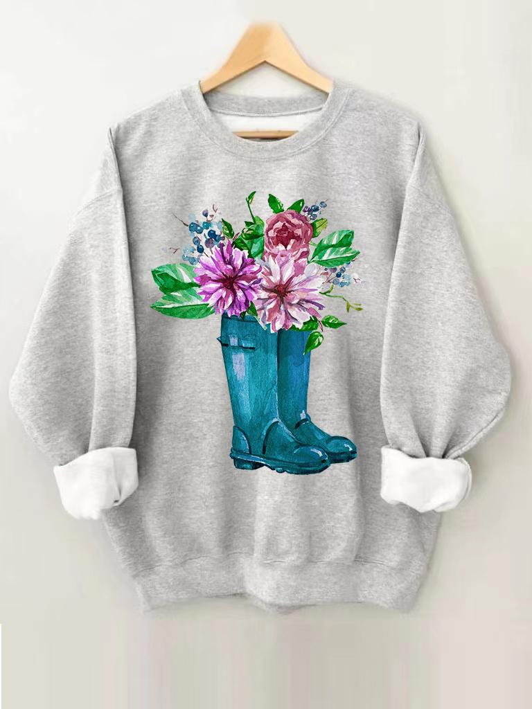 Women's Boots And Flowers Print Round Neck Sweatshirt