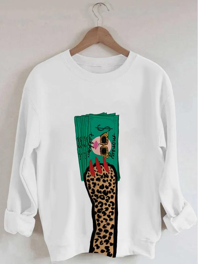 Women's Leopard Claw Money Print Long Sleeve Round Neck Sweatshirt
