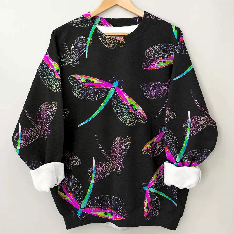 Women’s Dragonfly Print Long Sleeve Round Neck Sweatshirt - Black