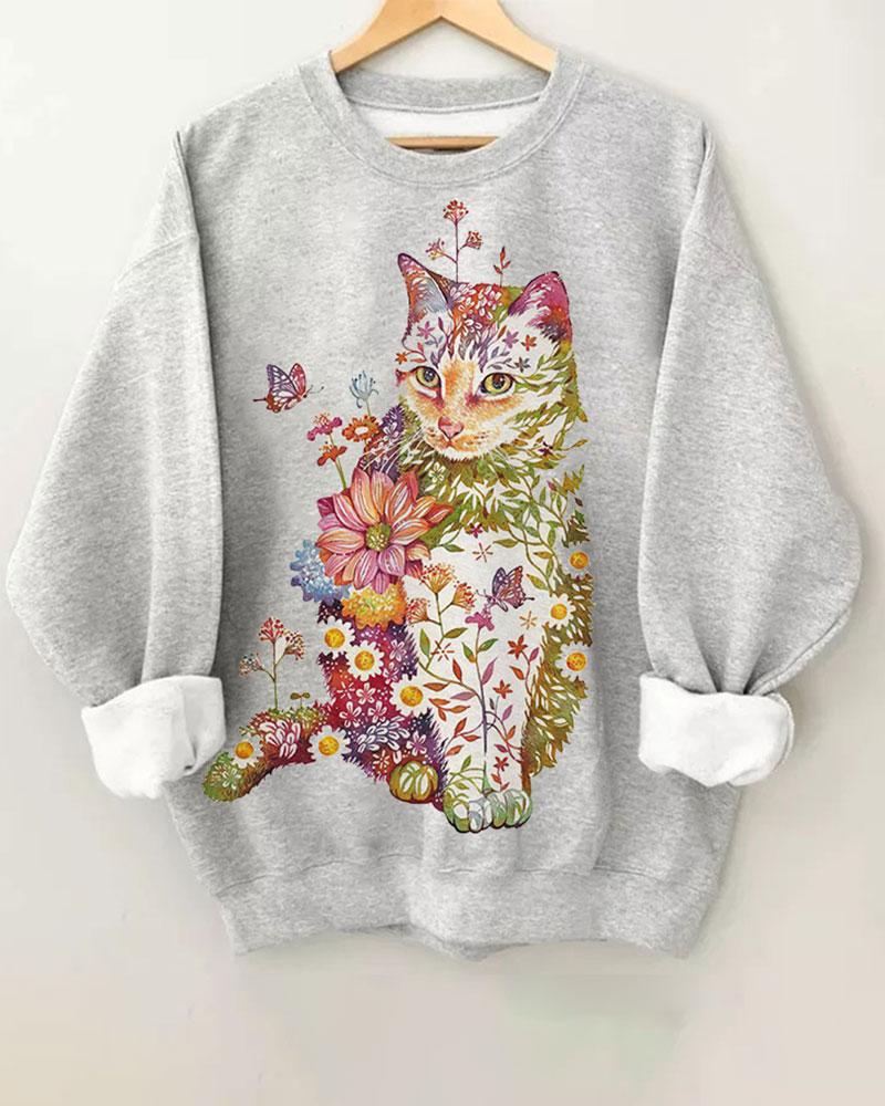 Women's Flower Cat Art Print Long Sleeve Round Neck Sweatshirt