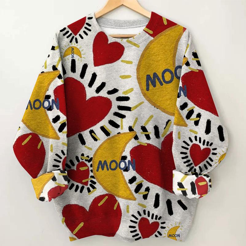 Women's Red Heart Yellow Moon Print Round Neck Sweatshirt